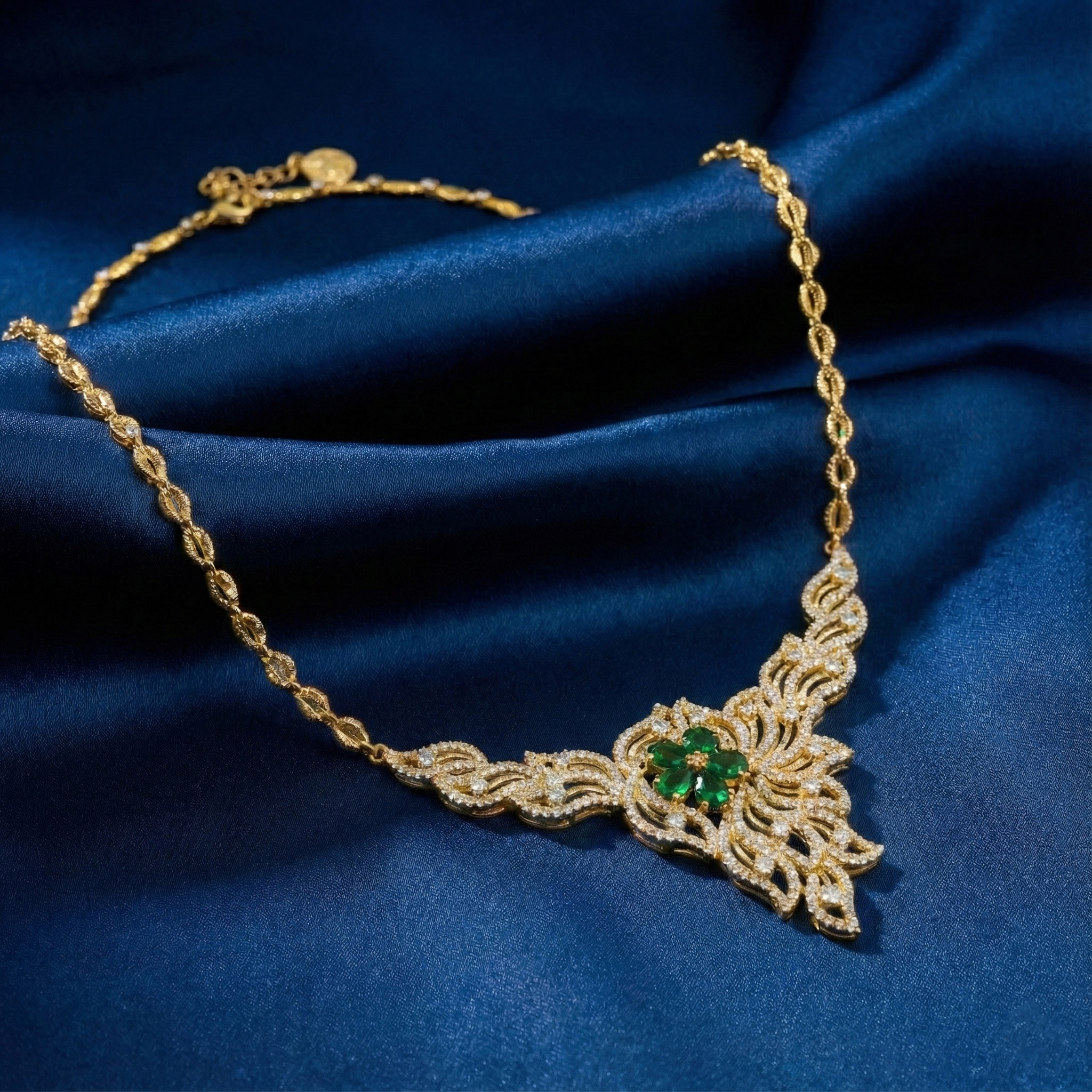 Hình cánh phượng mang phúc khí, với điểm nhấn viên đá màu xanh tạo dấu ấn thêm phẩn uyển chuyển như vũ điệu hoàng kim ôm lấy viên ngọc lục bảo.