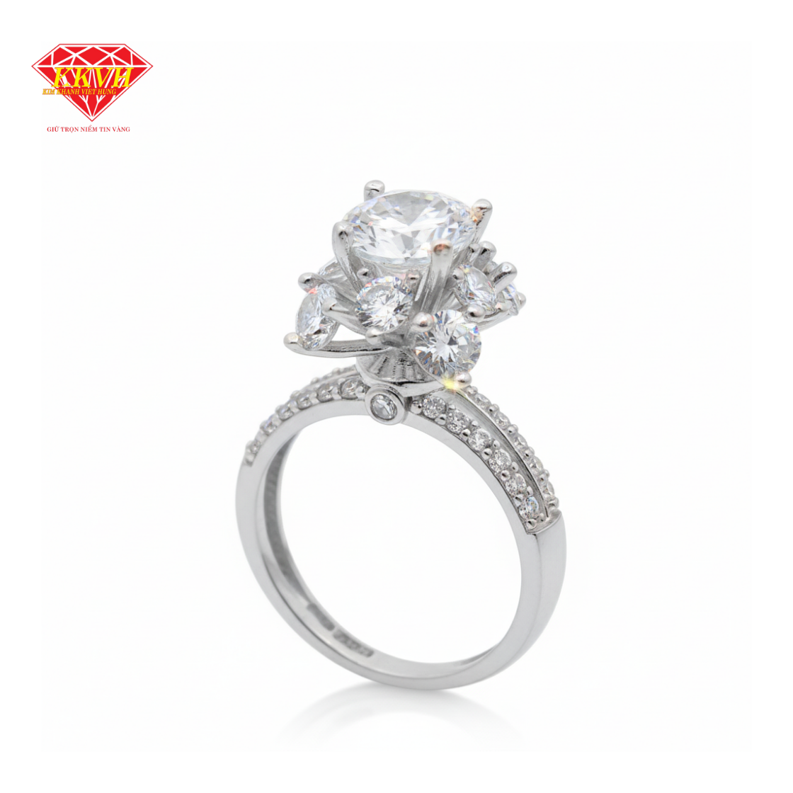 "Nhẫn Bạc Tinh Tú Hội Tụ" - Thiết kế tựa một chòm sao, nơi các viên đá quý phụ hội tụ quanh viên chủ, khuếch đại vẻ rực rỡ. Đai nhẫn chẻ đôi nạm tấm tinh tế, tạo nên một kiệt tác sang trọng, biểu tượng cho sự viên mãn và đẳng cấp.