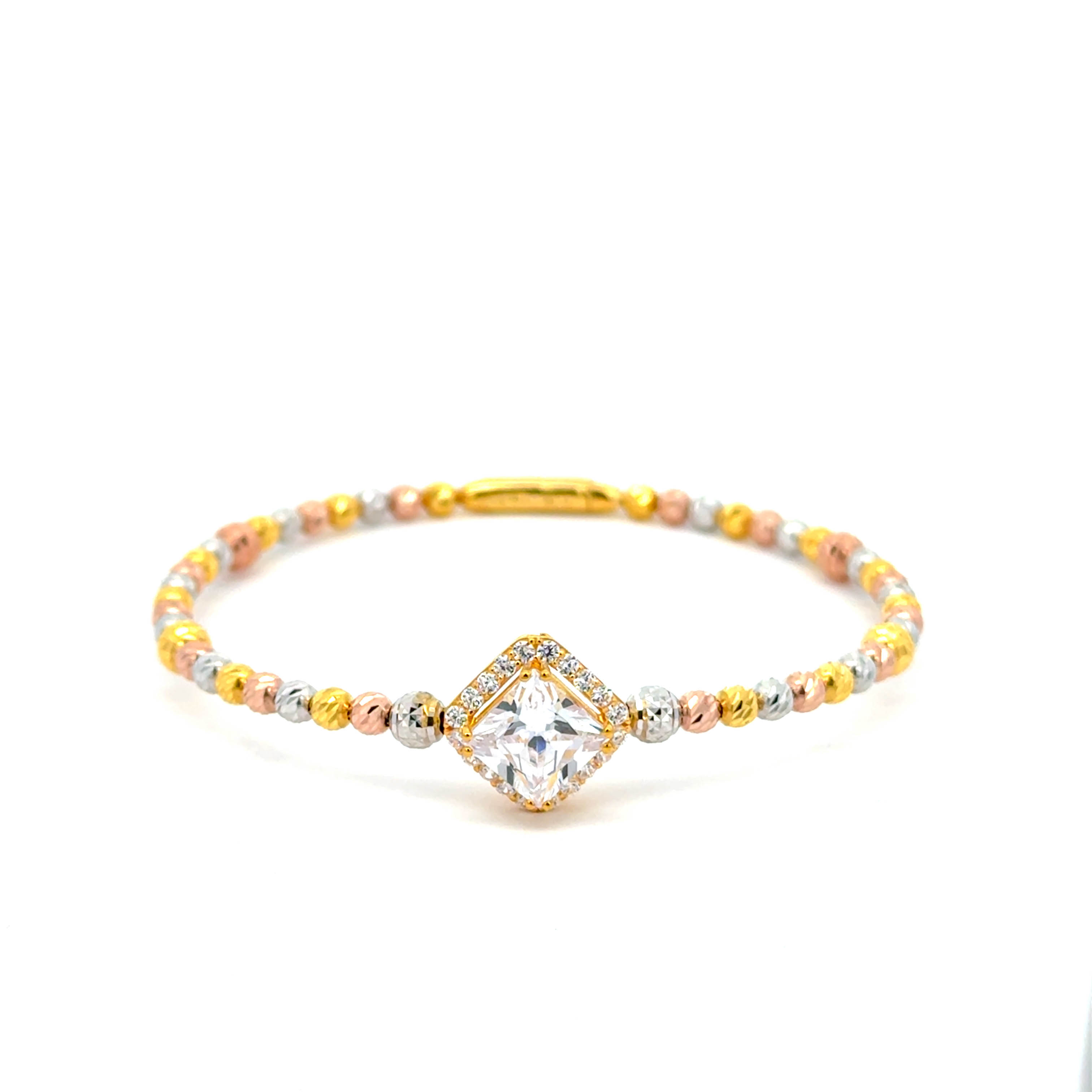 "Chiếc vòng tay mang thiết kế hài hòa giữa ba sắc màu ý nghĩa, kết hợp tâm điểm là viên đá thoi lấp lánh – như ánh sáng dẫn đường cho may mắn, tình yêu và thành công. Phù hợp để đeo hàng ngày hoặc làm quà tặng gửi trao yêu thương."