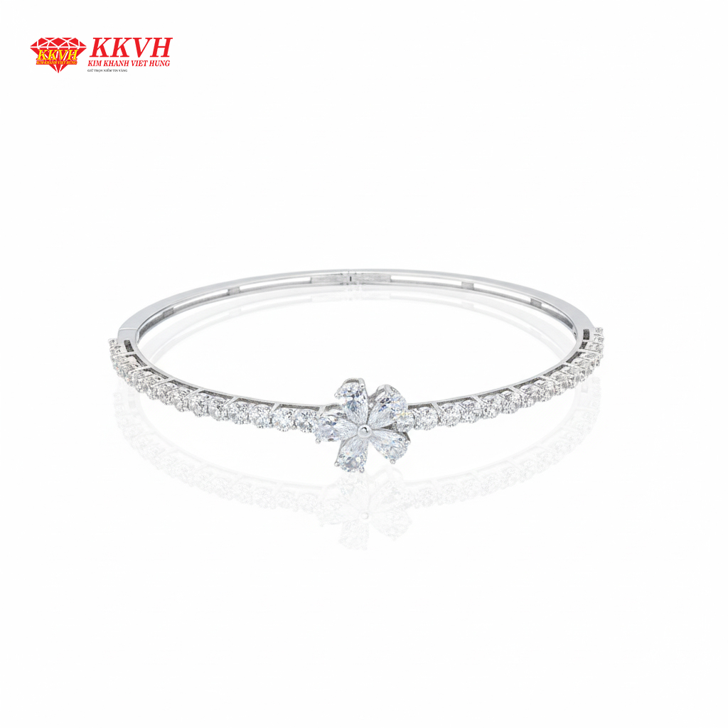 Tôn vinh vẻ đẹp thuần khiết, tinh khôi và sự tỏa sáng rực rỡ. Họa tiết hoa 5 cánh (hoặc hoa tuyết) được đính đá ở trung tâm, nổi bật trên đai nhẫn mảnh, là biểu tượng của sự may mắn, tình yêu trong sáng và sự thanh lịch tối giản.